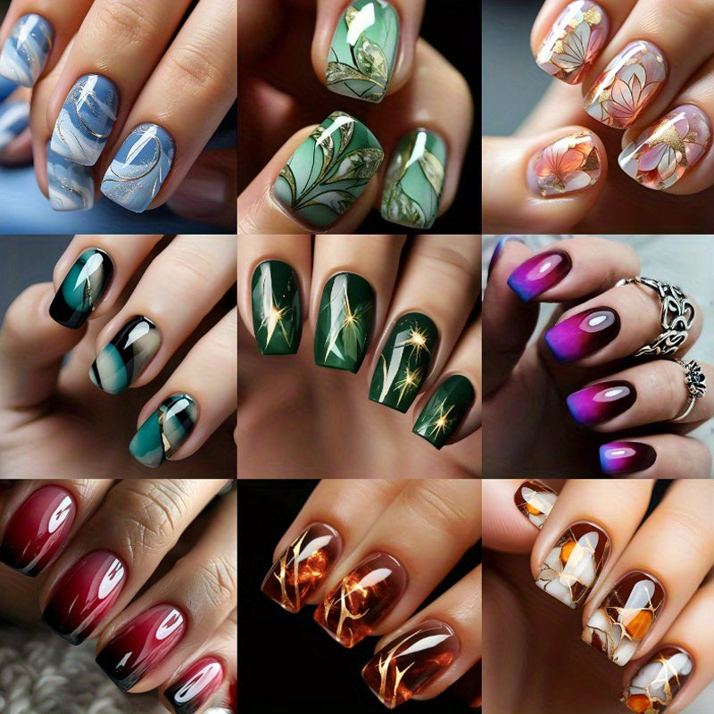 216pcs (9PACK)Pressing Nail Set - Medium Square, Glossy Surface, Striped and Gradient Design, Available in Brown, Blue, Purple Colors - Reusable Fake Nails, Suitable for Fashionable Nail Art Matching