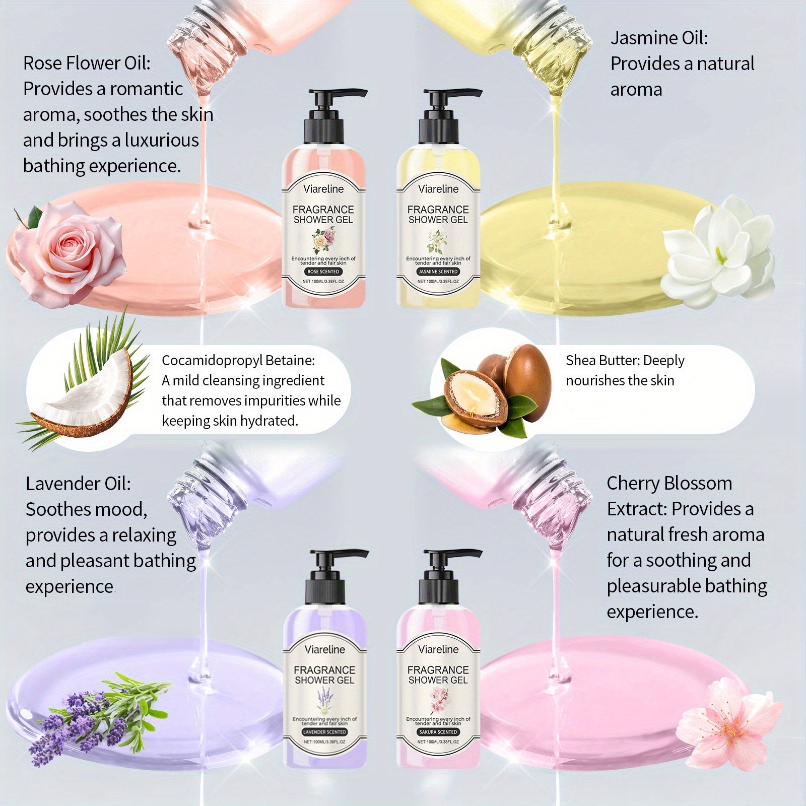 Indulge in a spa-like routine with the 4pcs Shower Fragrance Set—a Valentine's Day Gift Set designed to nourish, moisturize, and brighten your skin while enveloping you in a calming lavender aroma. This Holiday Fragrance Shower Gel collection blends rose and coconut with glycerin for everyday cleansing that leaves skin soft, smooth, and subtly perfumed, all in a light beige tinted gel for a touch of luxe.
