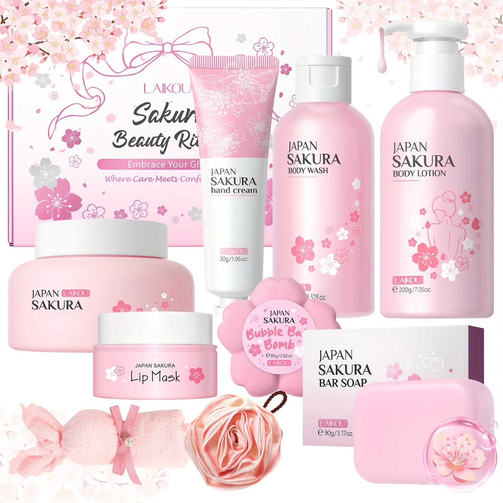 Sakura Body Bath Sets for Women Gift with Body Wash, Lotion, Soap, Bath Bomb, Scrub, Hand Cream & Lip Mask, Travel Essentials Skincare, Birthday Mother's Day Valentine's Day, Thanksgiving, And Christmas Gifts for Women