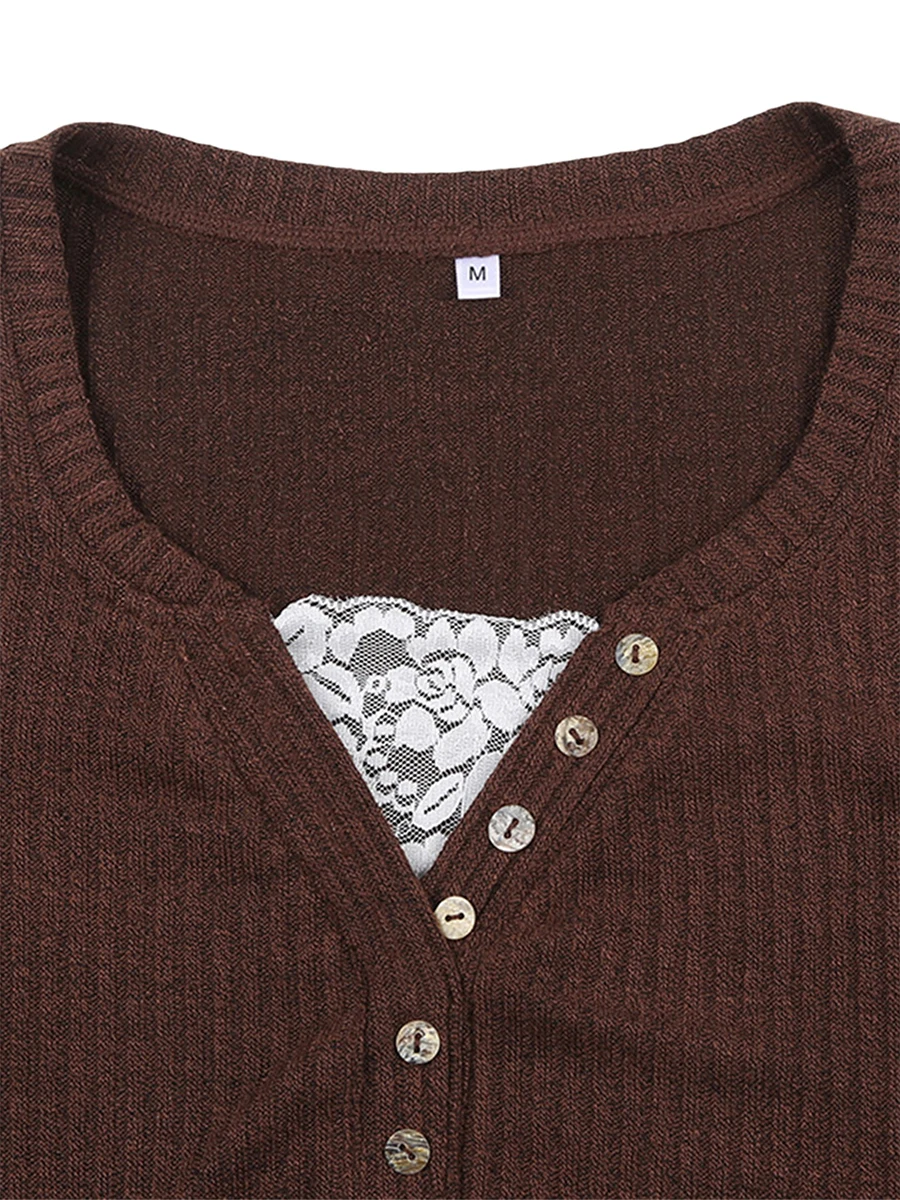 Women Button Front Knit Tops Long Sleeve Lace Patchwork Slim Fit Sweater Fall Fairy Grunge Gothic Y2K Clothes