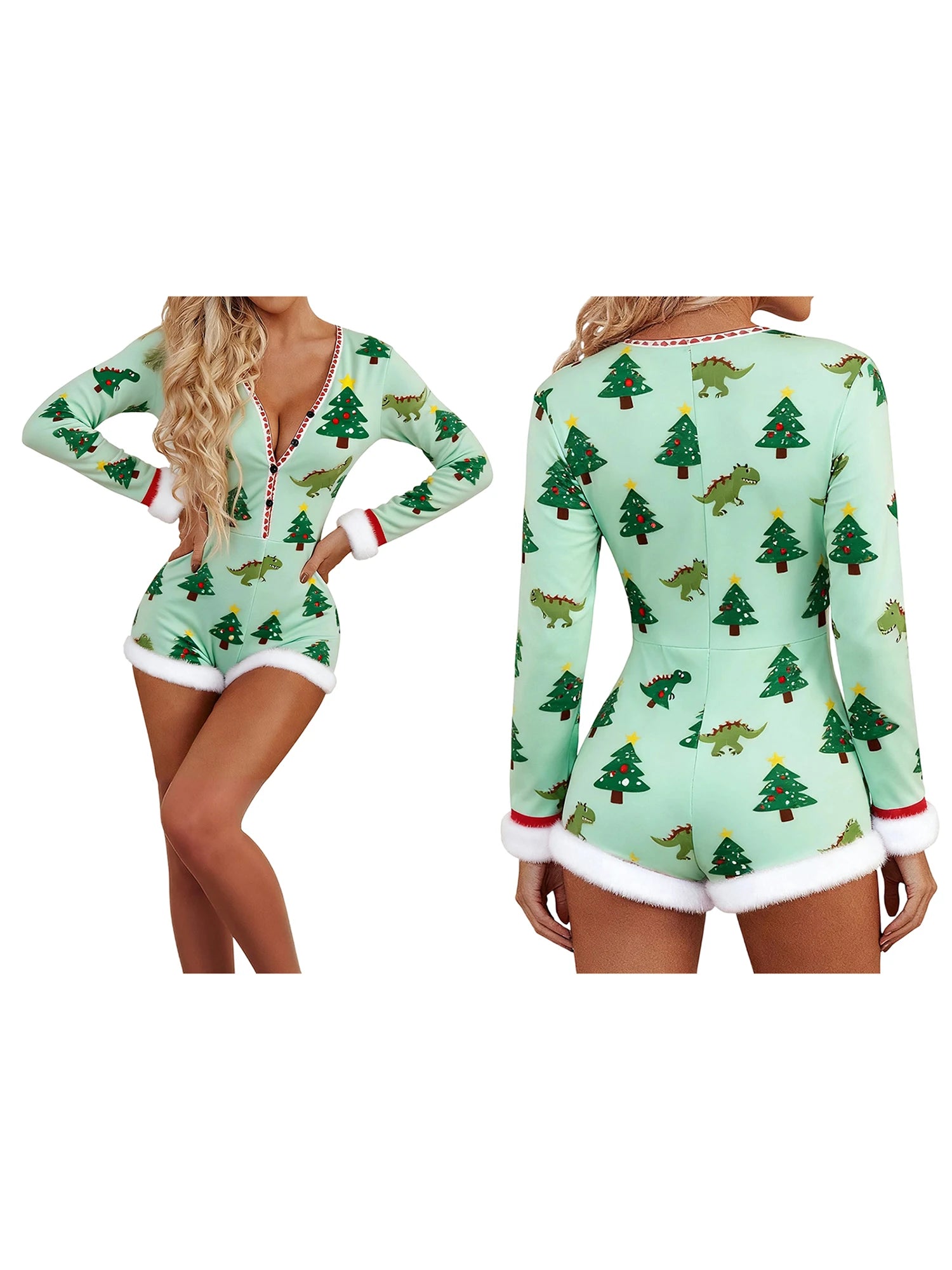 Women's Christmas Romper Pajamas Cute Cartoon Print Long Sleeve Fur Trim Jumpsuit Shorts Sleepwear